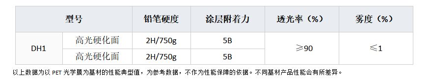 雙面都為硬化面,透明、高光澤、高亮度。高表面硬度、優(yōu)異的耐刮擦、耐磨損性能。
